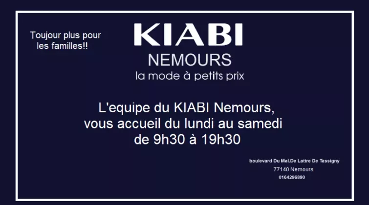 Votre magasin KIABI Nemours vous accueil du lundi au samedi de 9h30 à 19h30